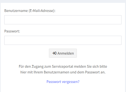 Sollten Sie Ihr Passwort vergessen haben, nutzen Sie bitte die "Passwort vergessen ?"-Funktion im Serviceportal und setzen Sie so ihr Passwort zurück.